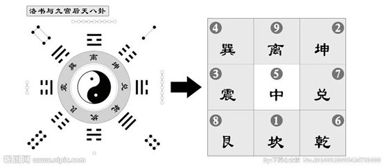 《黄帝内经》认为男性与女性的生命节律不一样,女性是以7的节律,男性则是以8为周期的。这是因为,洛书的8数与后天八卦艮位在同一位置上(如图),由于艮象征着少男,因此,男性从8岁开始计算发育周期,并且以8作为每一个周期的数。《黄帝内经·上古天真论》说:“丈夫八岁,肾气实,发长齿更; 二八,肾气盛,天癸至,精气溢泻,阴阳和,故能有子;三八,肾气平均,筋骨劲强,故真牙生而长极; 四八,筋骨隆盛,肌肉满壮; 五八,肾气衰,发堕齿槁; 六八,阳气衰竭于上,面焦,发鬓颁白; 七八,肝气衰,筋不能动,天癸竭,精少,肾藏衰,形体皆极;八八,则齿发去” 。