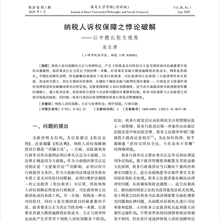同时,在课题组发布的2024年度研究报告《税法典立法的基础性问题研究》中,其第二部分第六章《纳税人诉权保障之悖论破解——以中德比较为视角》,由市税务学会会长池生清撰写。目前,该部分已发表于《集美大学学报(哲社版)》2025年第1期,是该课题组中第一个公开发表的论文。https://mp.weixin.qq.com/s/TWYZlAeVNqy4iYlxdBOswA